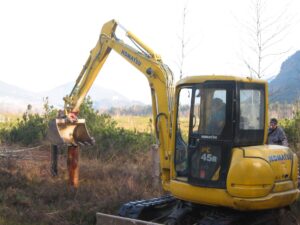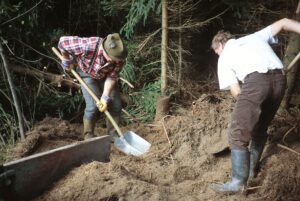 Die Piezometermethode: Die „Stöcke“, die sie während eines Moorspazierganges sehen, sind also Pegelrohre. Das sind mit Korkpfropfen verschließbare PVC Elektro-Installationsrohre mit einem Innendurchmesser von 14 mm und Längen von 100, 150 und 200 cm. Im Abstand von ca. 1 cm wurden sie im unterirdischen Bereich mit einem 0,6 mm Holzbohrer perforiert. Sie werden in den Torf senkrecht hineingerückt und soweit eingesenkt, dass sie etwa 30 cm aus dem Boden ragen. Die Ablesungen der Moorwasserstände in den Pegelrohren erfolgt durch das Hineinblasen in einen dünnen Plastikschlauch, an dem ein flexibles Metermaß befestigt ist. Die Ablesungen und Auswertungen werden gemeinsam mit der Ardninger Berg- und Naturwacht durchgeführt.