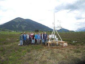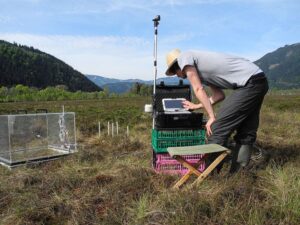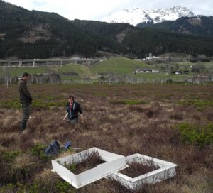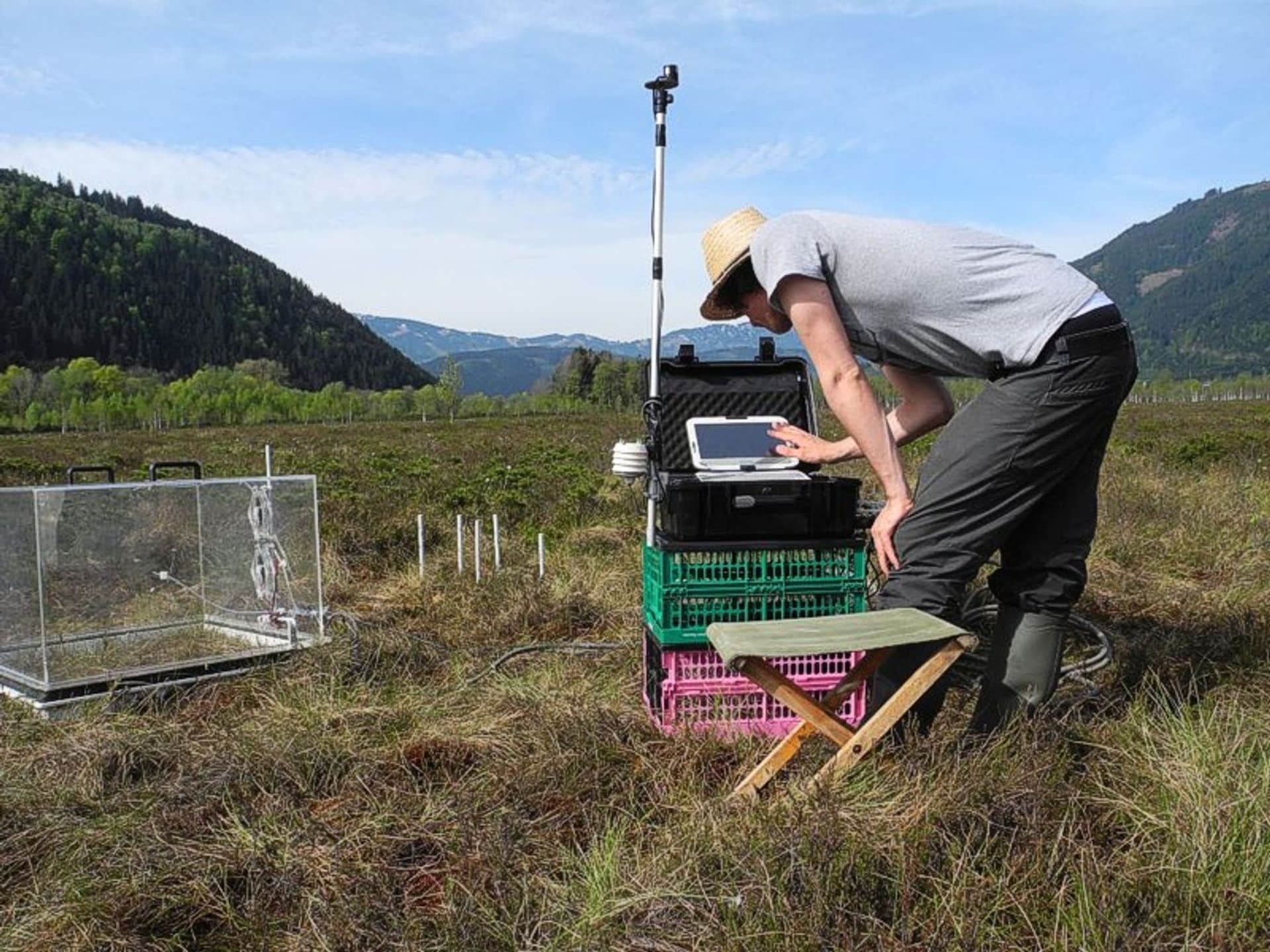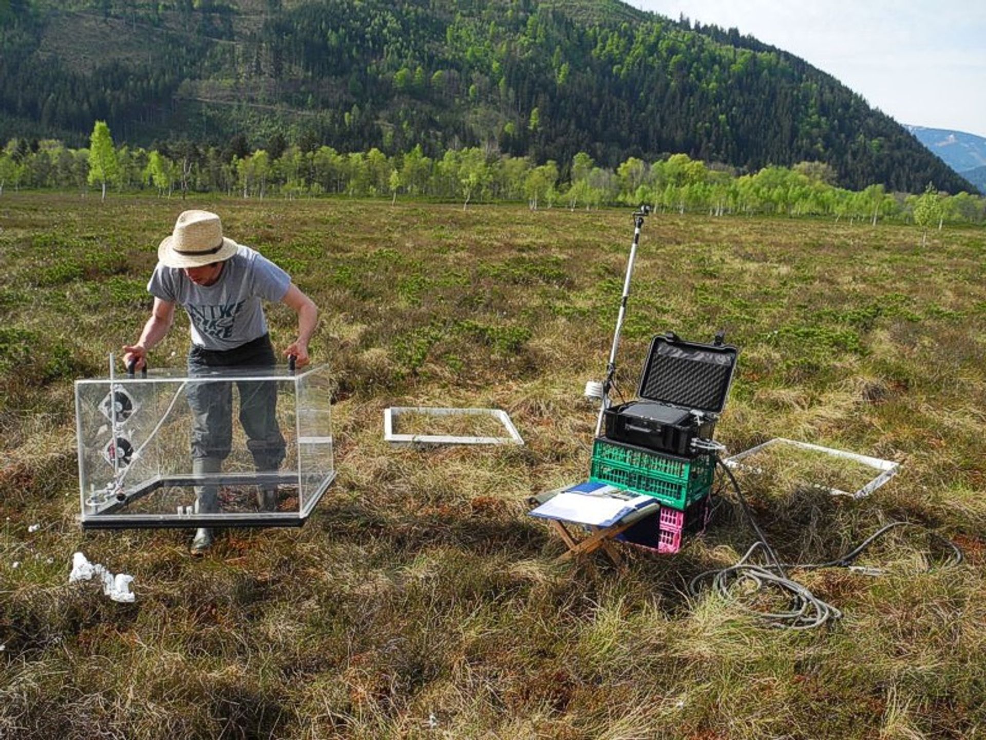 Mit Hilfe von Gasmesshauben untersucht die Arbeitsgruppe Geoökologie der Universität Wien den Kohlenstoffdioxid (CO2)-Austausch der Moorvegetation mit der Atmosphäre auf kleinem Raum. Dazu werden die Hauben auf fix-installierte Rahmen aufgesetzt und die Änderungen der CO2-Konzentrationen in der Haube gemessen. Mit transparenten und abgedunkelten Hauben kann festgestellt werden, wie viel Kohlenstoff fixiert oder freigesetzt wird. Während die Moorpflanzen durch die Photosynthese Kohlenstoffdioxid aus der Luft fixieren (Bruttoprimärproduktion), wird durch die Boden- und Pflanzenatmung (Ökosystem-Respiration) CO2 in die Atmosphäre freigesetzt. Da sich die CO2-Flüsse zwischen Moor und Atmosphäre je nach Pflanzenarten, Jahreszeit und Wasserstand stark unterscheiden, ist es wichtig diese Messungen an unterschiedlichen Standorten durchzuführen. Mit Hilfe der Haubenmessmethode kann auch die Methan-Freisetzungsrate der Moorböden bestimmt werden. Methan (CH4) ist ein besonders wirksames Treibhausgas, das bei der Zersetzung pflanzlicher Bestandteile unter Sauerstoffabschluss entsteht. Auf einen Zeithorizont von 100 Jahren bezogen, trägt Methan 25 bis 33 Mal so stark zum Treibhauseffekt bei wie Kohlenstoffdioxid.